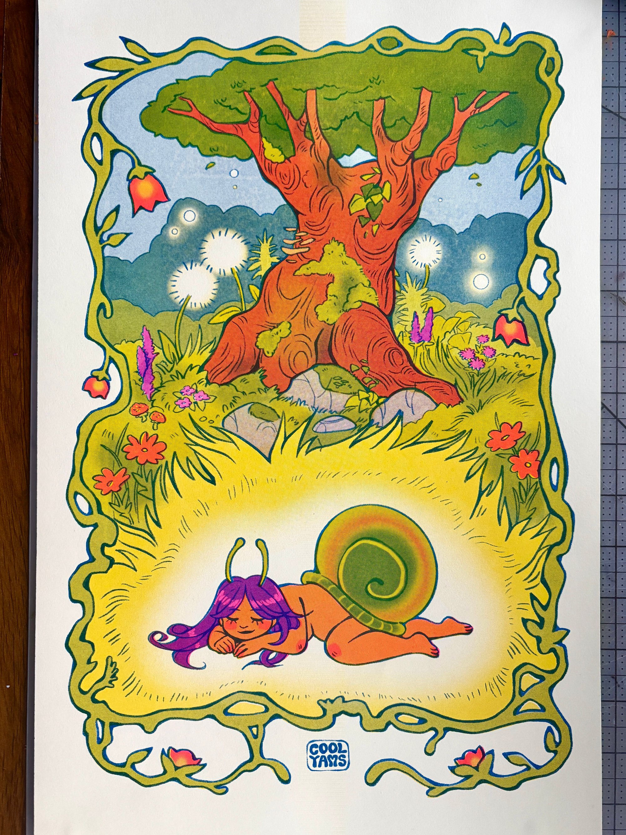 -Riso Prints are made using an ink that is plant based and non-archival. Once printed it doesn’t completely dry, so it might smudge if you rub it. Framing it is recommended!